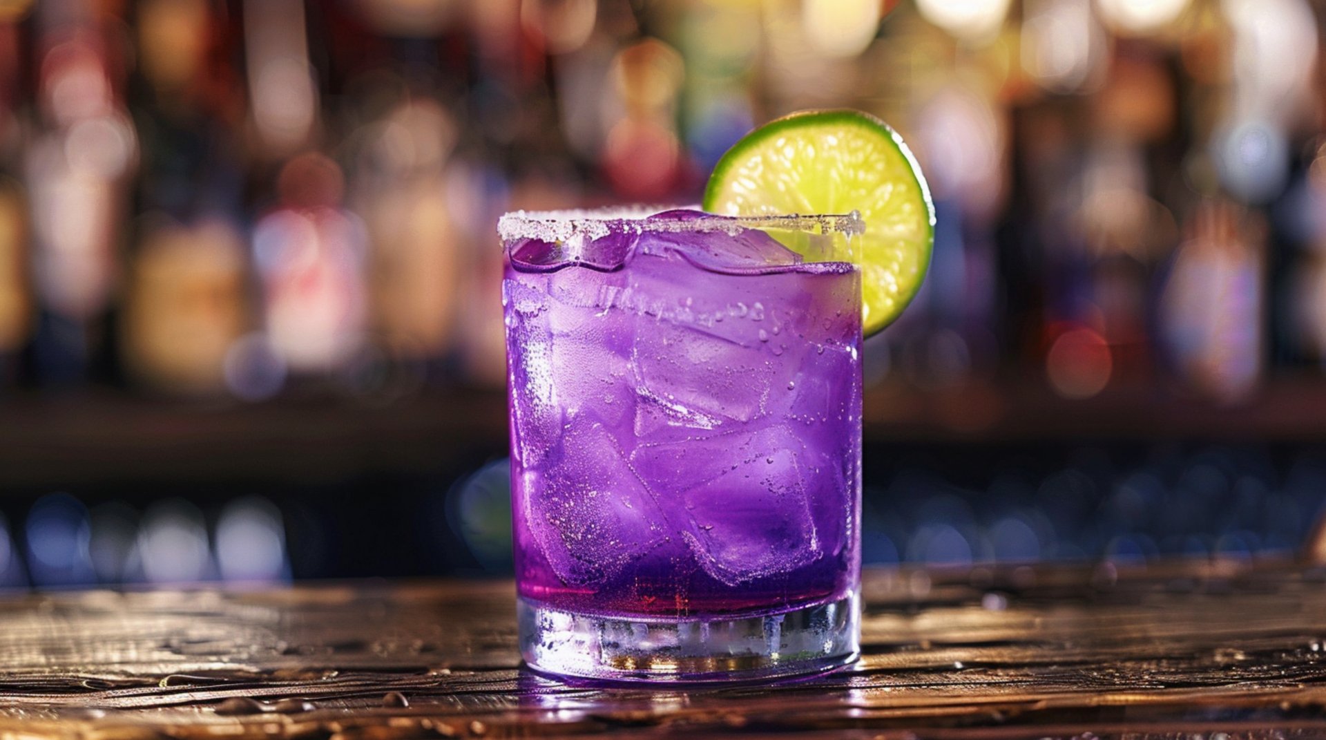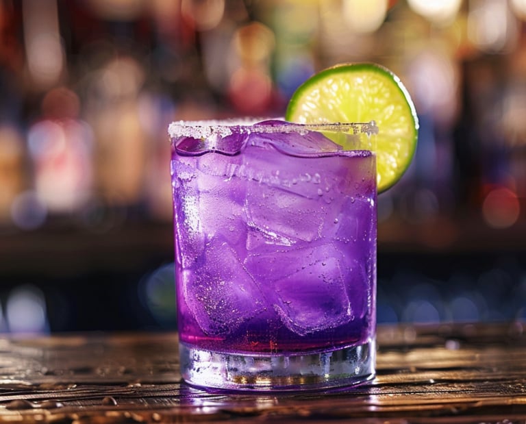 A Pakshee signature drink created for The Great Train Robbery. A purple margarita with a lime wheel, a more 'everyday' version of the legendary Pakshee cocktail, the Madame Herself.