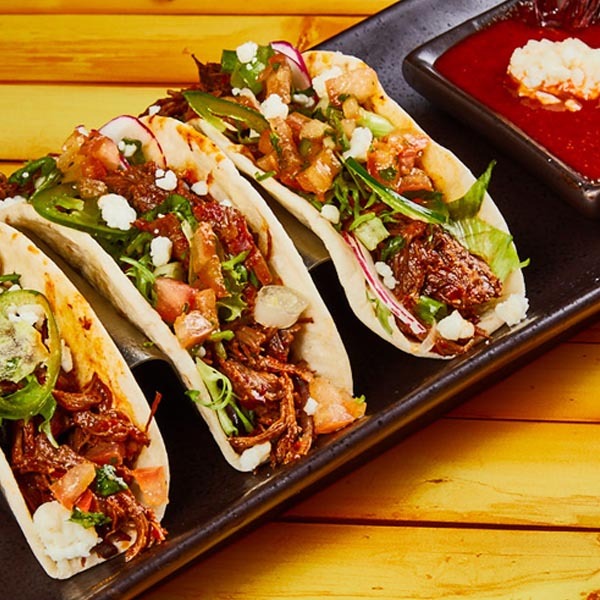Like the legendary outlaw gang, but come to pillage your taste buds like a bank vault. A flight of three mini tacos- birria (shredded stewed rroneek), pulled chicken, and pescado (battered fish with greens and white sauce) that will leave you thirsting for another tangle.