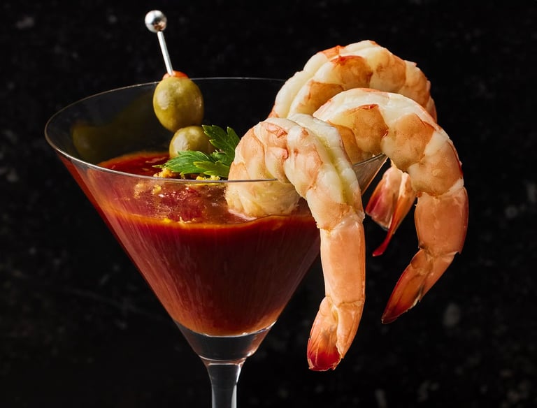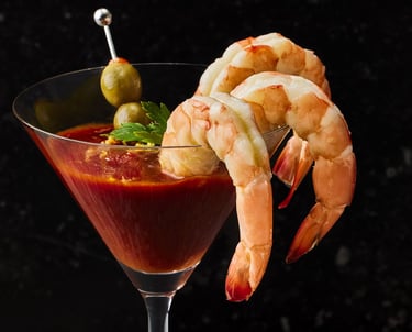 Cooked, chilled shrimp served with lemon wedges on the rim of a cocktail glass with speared olives. We promise this is related to Act One. Just trust us.