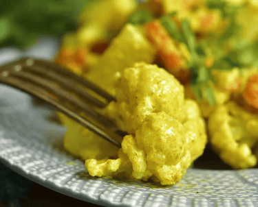 Roasted cauliflower cooked in a golden mild Pakshee Signature Curry and served with mixed vegetables for a warm, vegetarian appetizer.